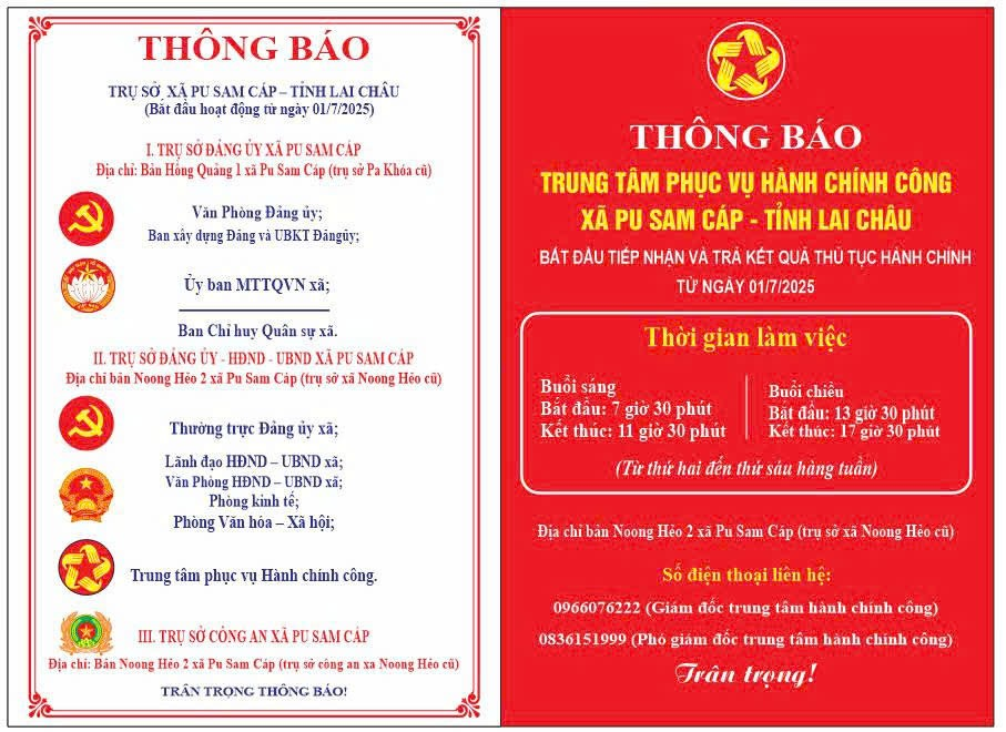 THÔNG BÁO TRỤ SỞ ĐẢNG ỦY, HĐND-UBND XÃ PU SAM CÁP TỪ NGÀY 01/7/1025