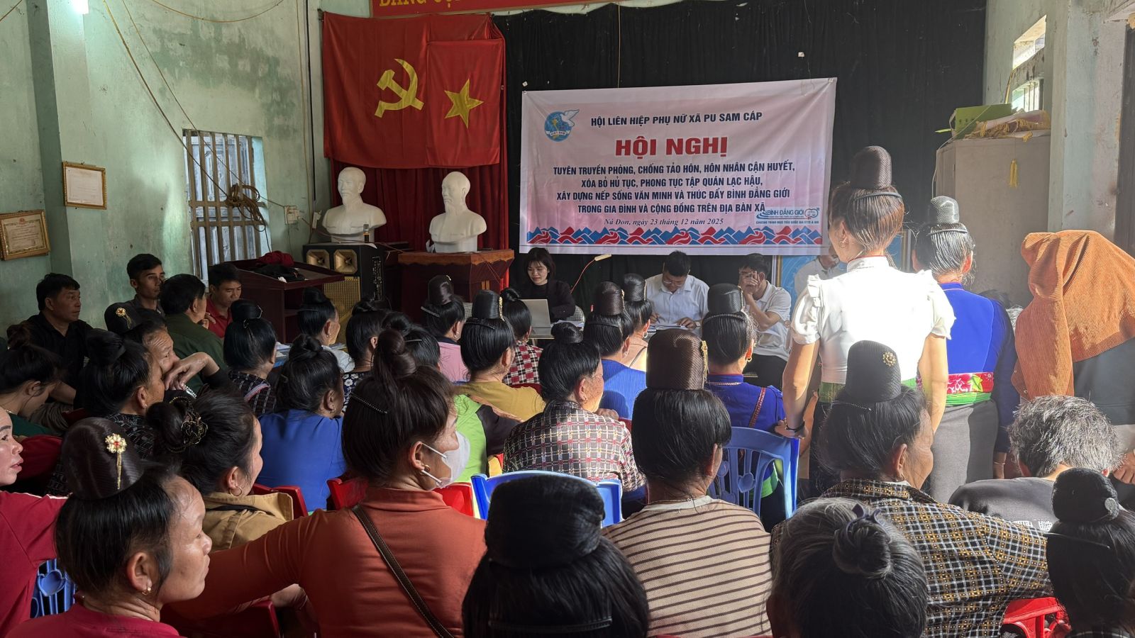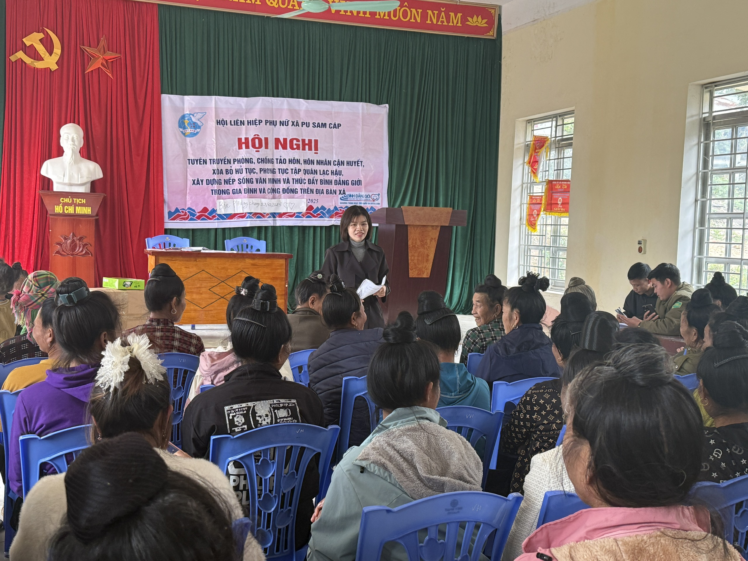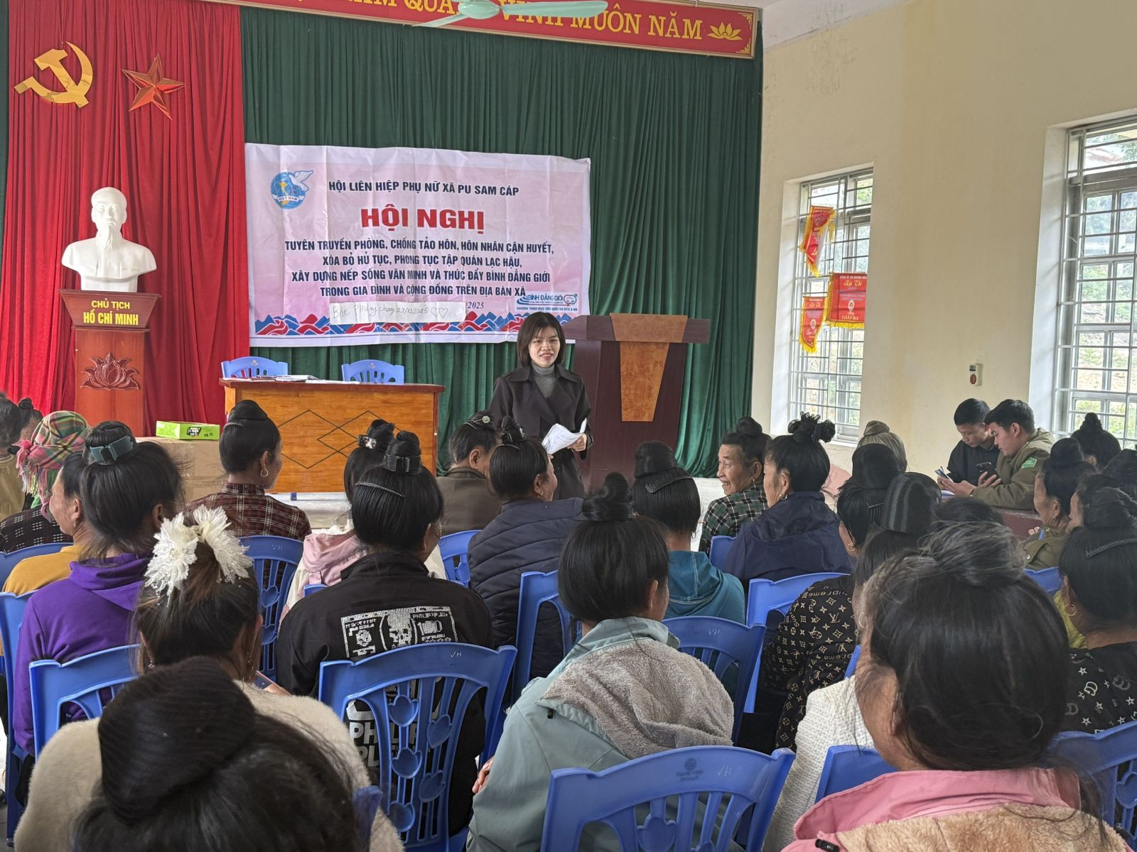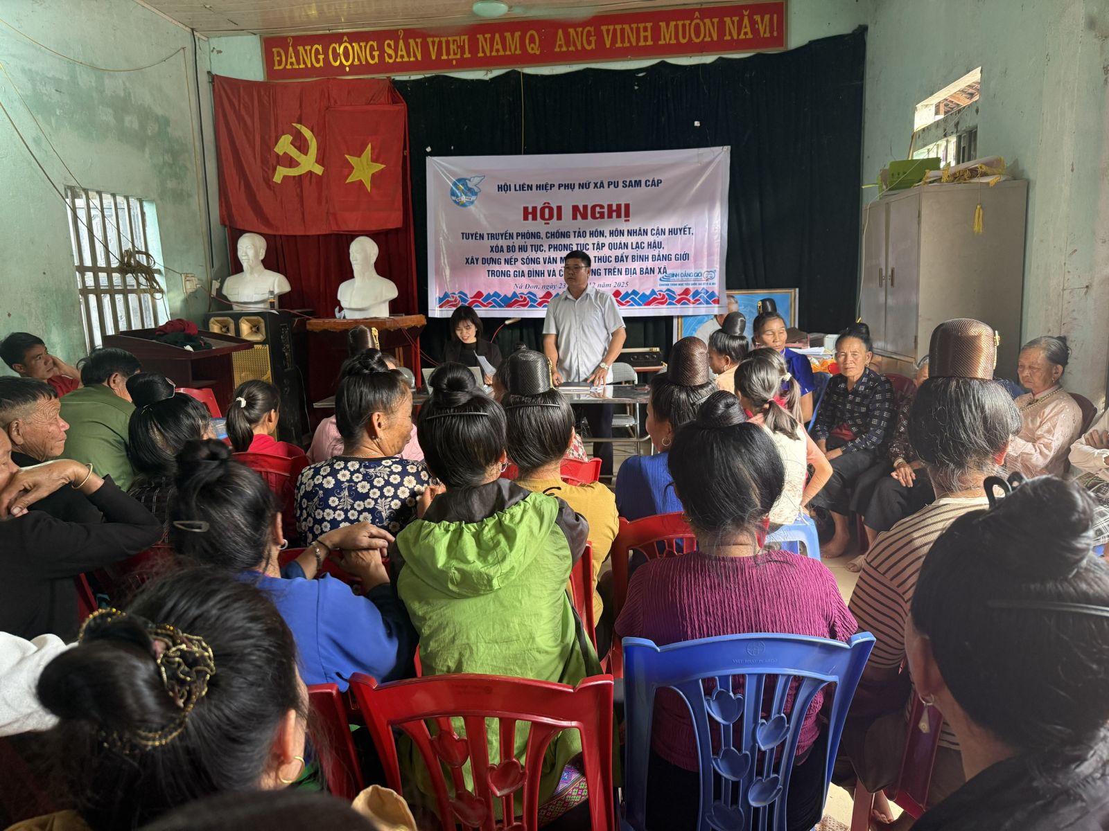 Xã Pu Sam Cáp có 2143 hộ với 11560 nhân khẩu chủ yếu là đồng bào Mông, Dao, Thái ... sinh sống tại 19 bản. Trong năm 2025 toàn xã ghi nhận có 6 cặp tảo hôn, không có cặp nào hôn nhân cận huyết, cùng với đó là một số hủ tục, tập quán nhỏ còn tồn tại. Để giảm thiểu các tình trạng tảo hôn, hôn nhân cận huyết và từng bước xóa bỏ hủ tục nhằm nâng cao chất lượng đời sống cho nhân dân, chính quyền xã Pu Sam Cáp đã đẩy mạnh các buổi tuyên truyền thôn bản. Đặc biệt triển khai Thực hiện Dự án 8 – “Thực hiện bình đẳng giới và giải quyết những vấn đề cấp thiết đối với phụ nữ và trẻ em”, thời gian qua, xã Pu Sam Cáp đã đẩy mạnh công tác truyền thông trực tiếp tại các bản, tập trung vào phòng, chống tảo hôn, hôn nhân cận huyết thống; xóa bỏ hủ tục, phong tục tập quán lạc hậu; phòng, chống bạo lực gia đình và thúc đẩy bình đẳng giới trong gia đình, cộng đồng. Các buổi truyền thông được tổ chức ngay tại nhà văn hóa bản, với sự tham gia của đông đảo người dân, gồm nam, nữ, thanh niên, già làng, trưởng bản, người có uy tín và cán bộ chi hội. Nội dung tuyên truyền được xây dựng ngắn gọn, dễ hiểu, kết hợp trao đổi và thảo luận, kể chuyện thực tế tại địa phương, giúp người dân mạnh dạn chia sẻ quan điểm, suy nghĩ của mình. Ngay từ những câu hỏi đầu tiên, tuyên truyền viên đã đặt những câu hỏi gần gũi như: “Ở bản ta còn tình trạng con trai, con gái lấy vợ, lấy chồng khi chưa đủ tuổi không?”, “Theo bà con, tảo hôn có lợi hay có hại?”. Không khí buổi truyền thông vì thế trở nên cởi mở, thân thiện, tạo điều kiện để người dân thẳng thắn nhìn nhận những tồn tại ngay trong chính cộng đồng mình. Qua đó, người dân được làm rõ khái niệm tảo hôn là việc nam, nữ kết hôn khi chưa đủ tuổi theo quy định của pháp luật (nam chưa đủ 20 tuổi, nữ chưa đủ 18 tuổi). Nguyên nhân dẫn đến tảo hôn ở một số bản được chỉ ra cụ thể như: Ảnh hưởng phong tục cũ, nhận thức còn hạn chế, việc quản lý con cái chưa chặt chẽ, tình trạng bỏ học sớm do yêu đương, mang thai ngoài ý muốn. Các tuyên truyên viên cũng đã chỉ ra hậu quả của tảo hôn ảnh hưởng đến một cá nhân hay gia đình mà để lại hệ lụy lâu dài cho cả cộng đồng như thế nào. Phụ nữ mang thai sớm có nguy cơ cao gặp tai biến sản khoa; trẻ sinh ra dễ suy dinh dưỡng, chậm phát triển ra sao, cũng như việc bỏ học sớm khiến thanh niên không có nghề nghiệp ổn định, cái nghèo cứ thế kéo dài qua nhiều thế hệ. Đặc biệt, hôn nhân cận huyết thống, kết hôn giữa những người có quan hệ huyết thống gần, được cảnh báo là vô cùng nguy hiểm, ảnh hưởng trực tiếp đến giống nòi, khi trẻ sinh ra có nguy cơ mắc dị tật, bệnh bẩm sinh. Thông điệp được nhấn mạnh nhiều lần tại buổi truyền thông là: “Tảo hôn và hôn nhân cận huyết không chỉ làm khổ một gia đình mà làm nghèo cả bản, cả xã”