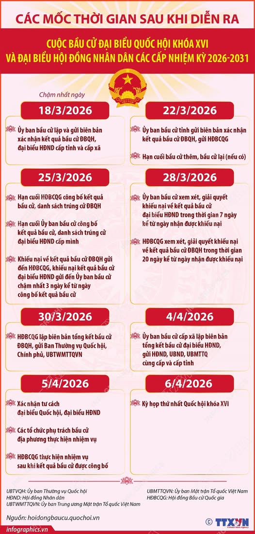 Ngày 15/3/2026, cử tri cả nước đã đi bầu cử đại biểu Quốc hội khóa XVI và đại biểu Hội đồng nhân dân các cấp nhiệm kỳ 2026-2031, lựa chọn những người tiêu biểu, xứng đáng, đại diện cho ý chí, nguyện vọng và quyền làm chủ của nhân dân. Sau ngày bầu cử, Hội đồng Bầu cử Quốc gia và Ủy ban Bầu cử các địa phương tiếp tục triển khai nhiều công việc quan trọng để hoàn tất quy trình bầu cử theo đúng quy định của pháp luật, đảm bảo kết quả phản ánh trung thực ý chí và nguyện vọng của cử tri. TTXVN trân trọng giới thiệu một số mốc thời gian quan trọng sau khi diễn ra cuộc bầu cử ĐBQH khóa XVI và đại biểu HĐND các cấp nhiệm kỳ 2026-2031.
