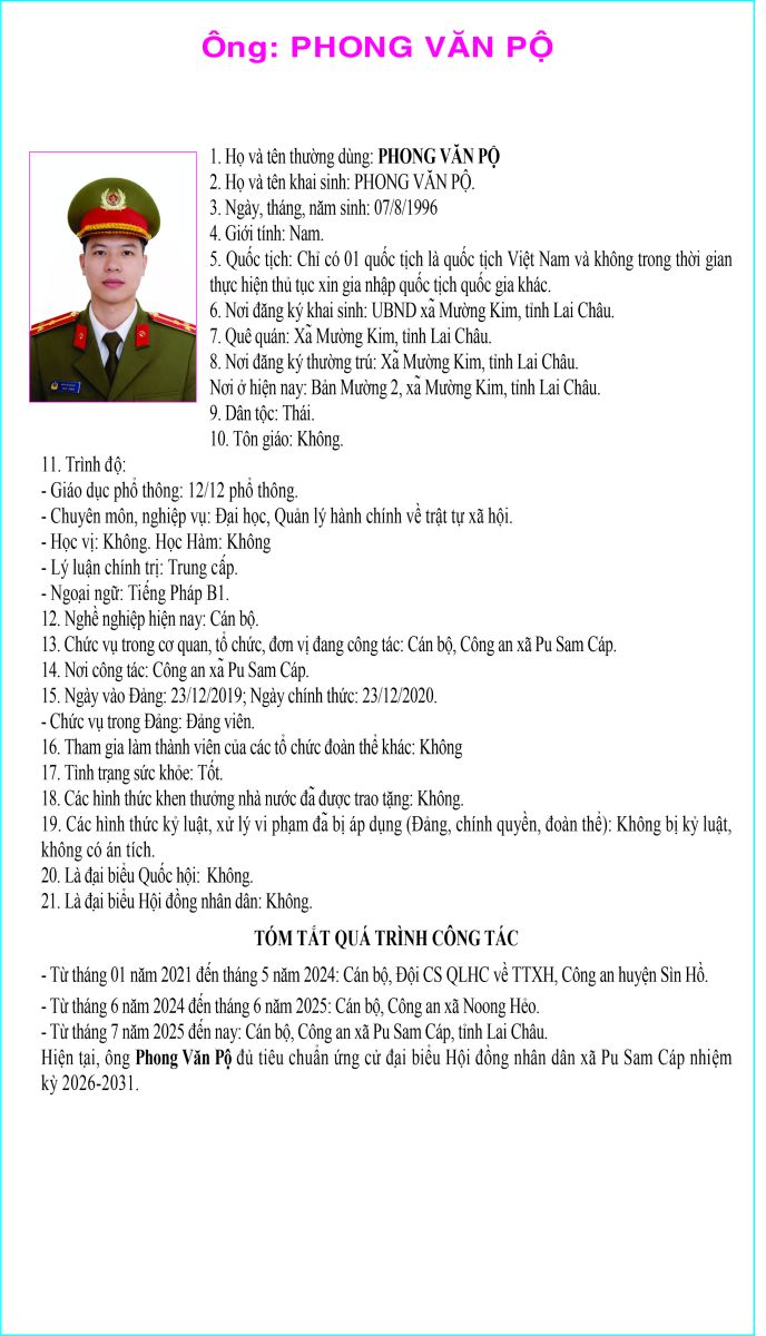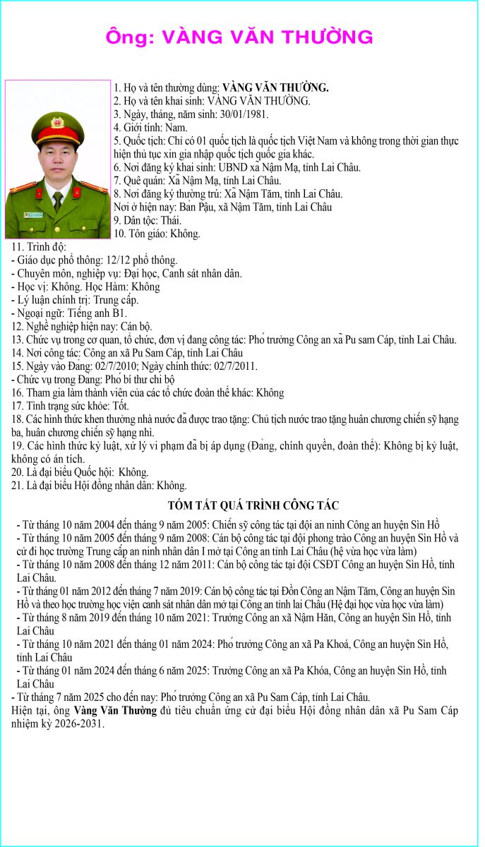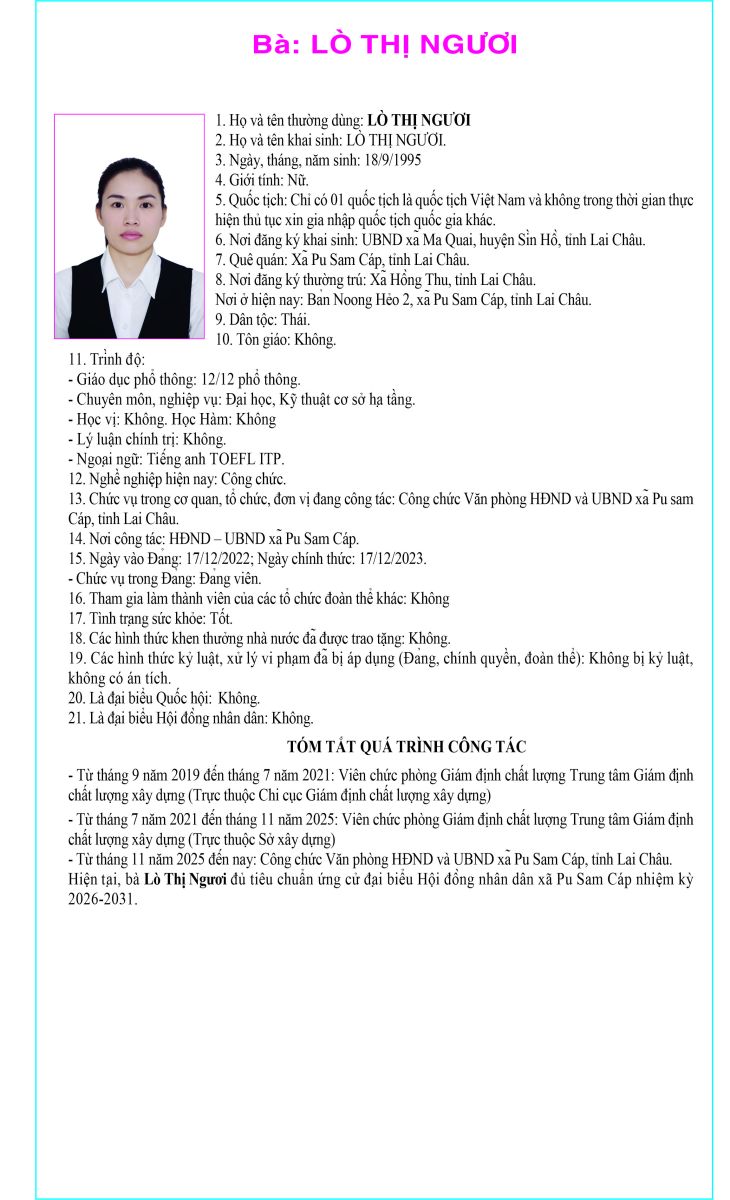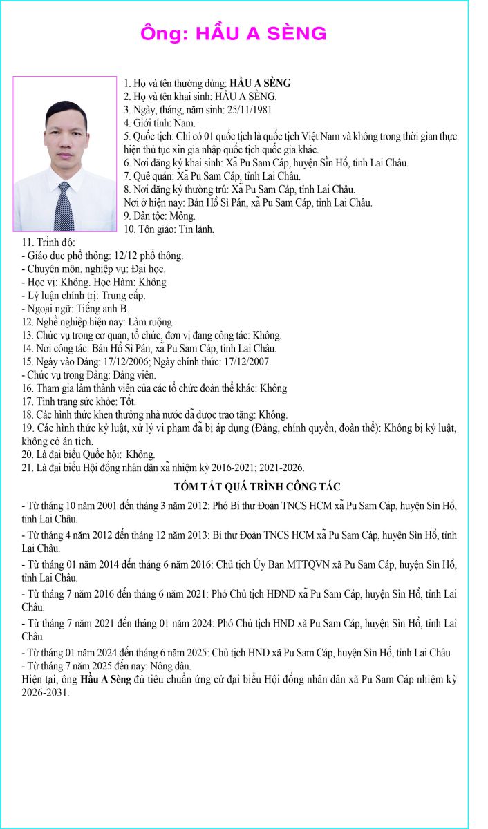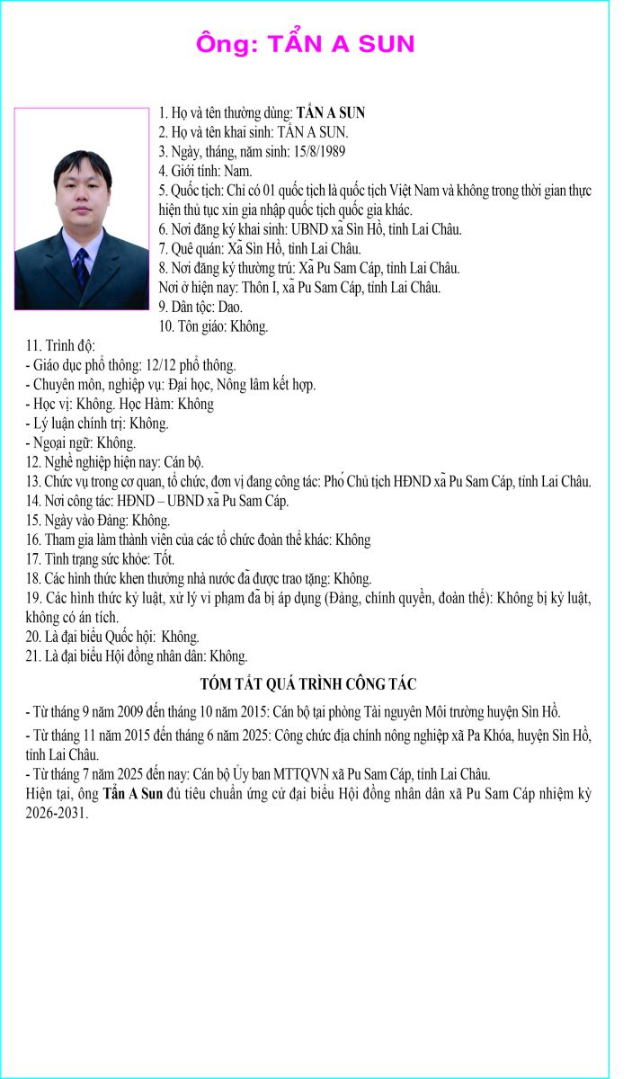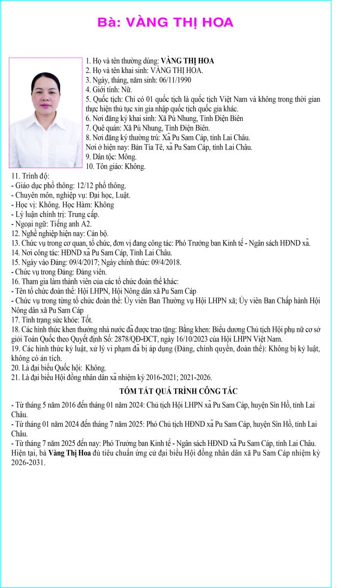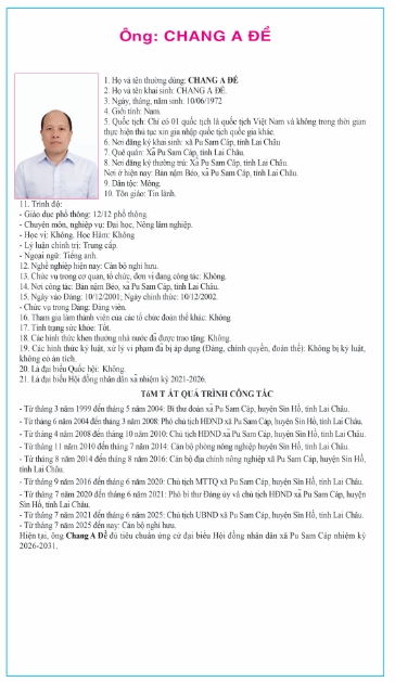 TIỂU SỬ TÓM TẮT NGƯỜI ỨNG CỬ ĐẠI BIỂU HỘI ĐỒNG NHÂN DÂN XÃ PU SAM CÁP NHIỆM KỲ 2026 - 2031 TẠI ĐƠN VỊ BẦU CỬ SỐ 2
