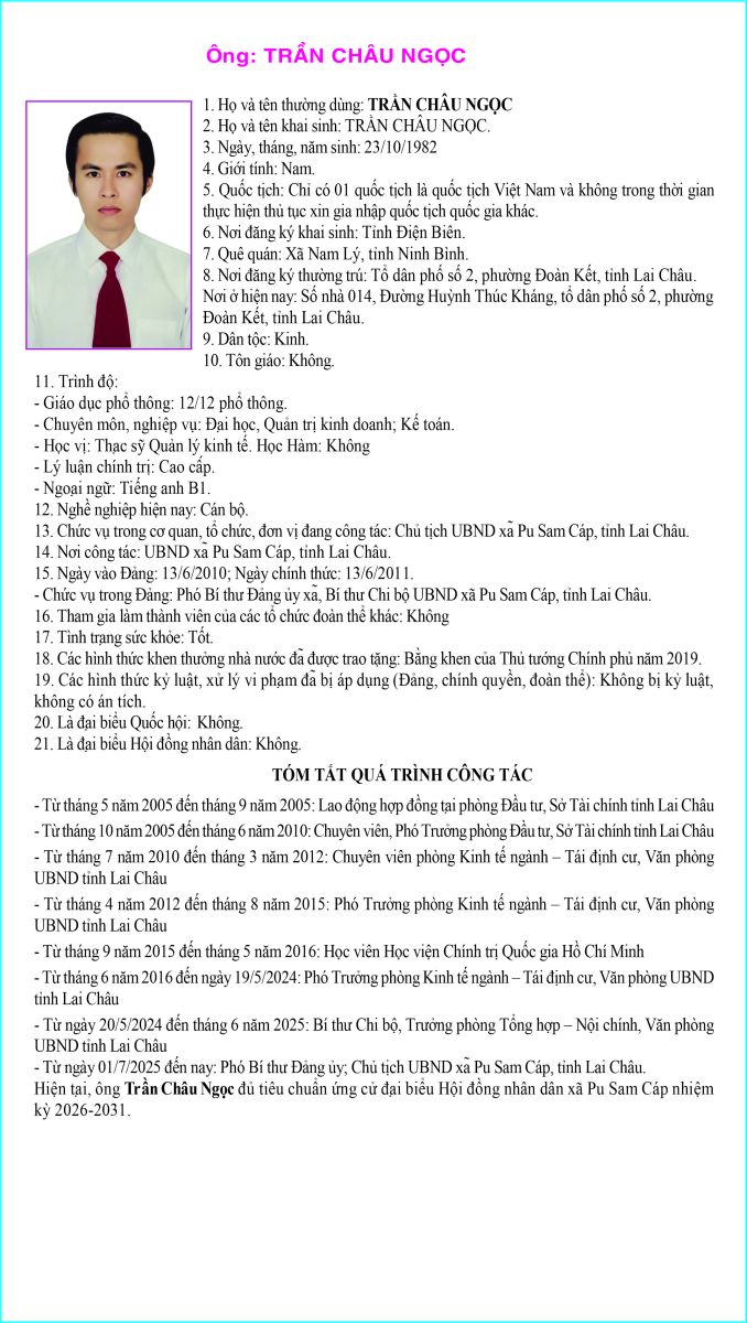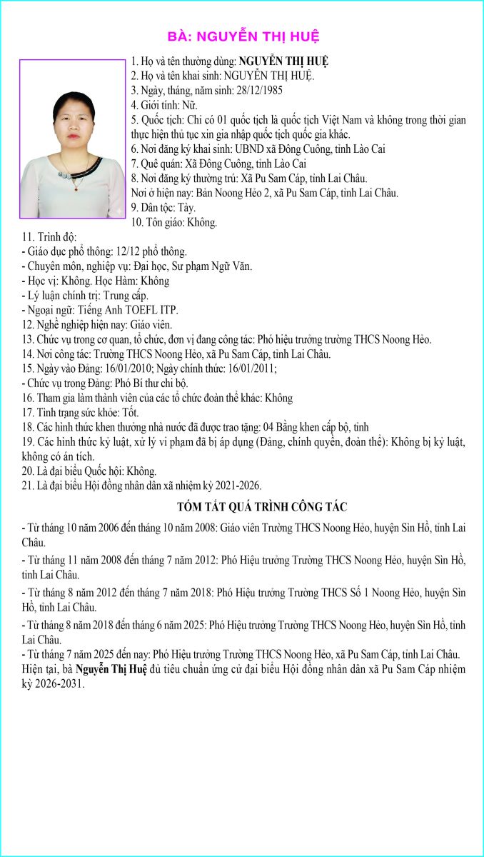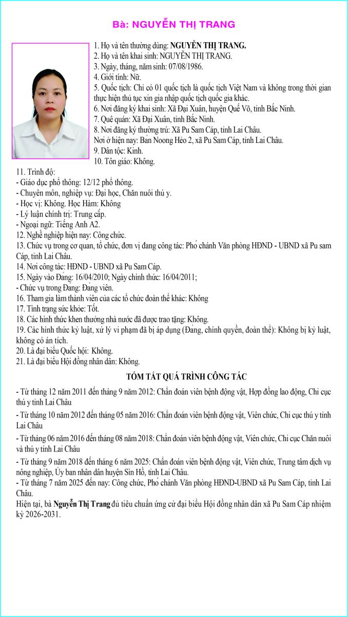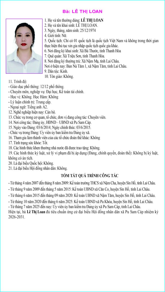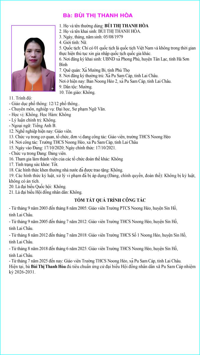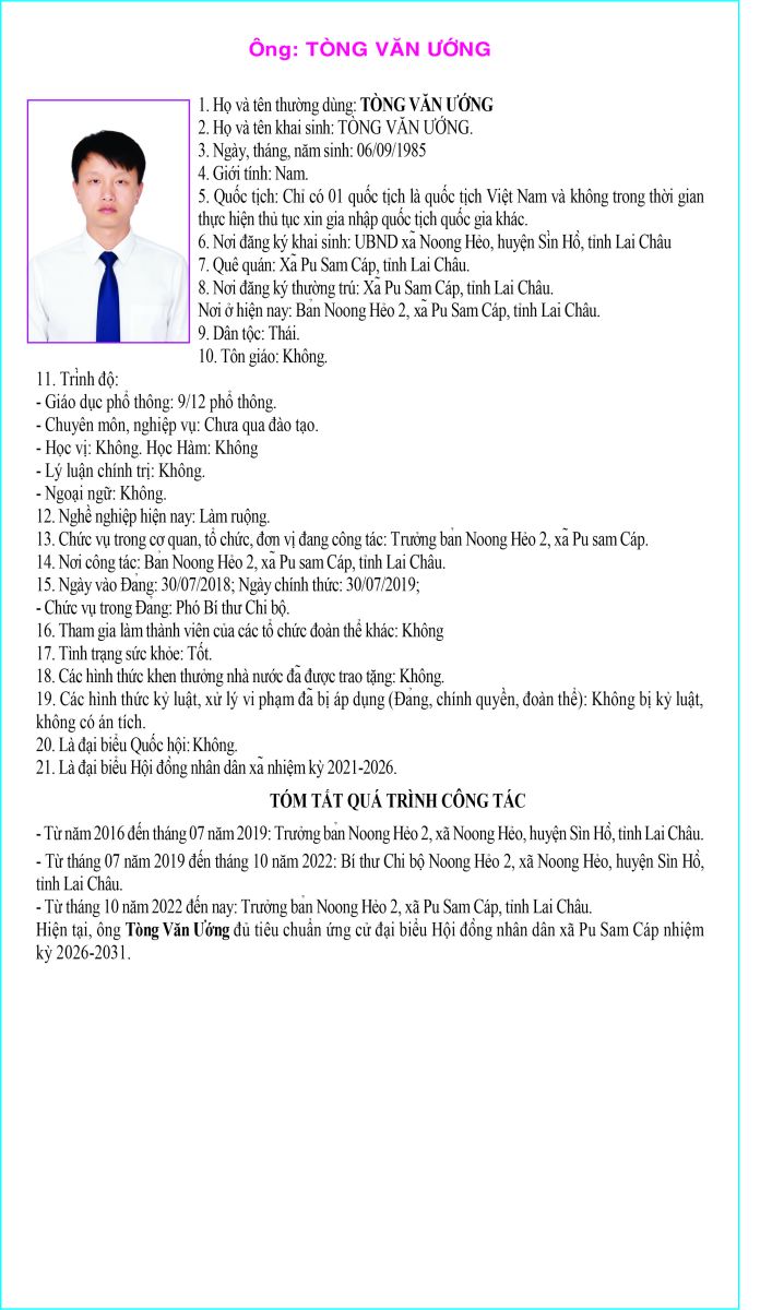 TIỂU SỬ TÓM TẮT NGƯỜI ỨNG CỬ ĐẠI BIỂU HỘI ĐỒNG NHÂN DÂN XÃ PU SAM CÁP NHIỆM KỲ 2026 - 2031 TẠI ĐƠN VỊ BẦU CỬ SỐ 3