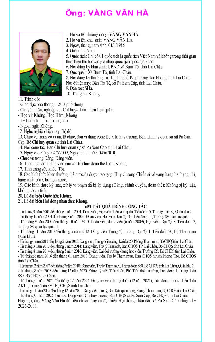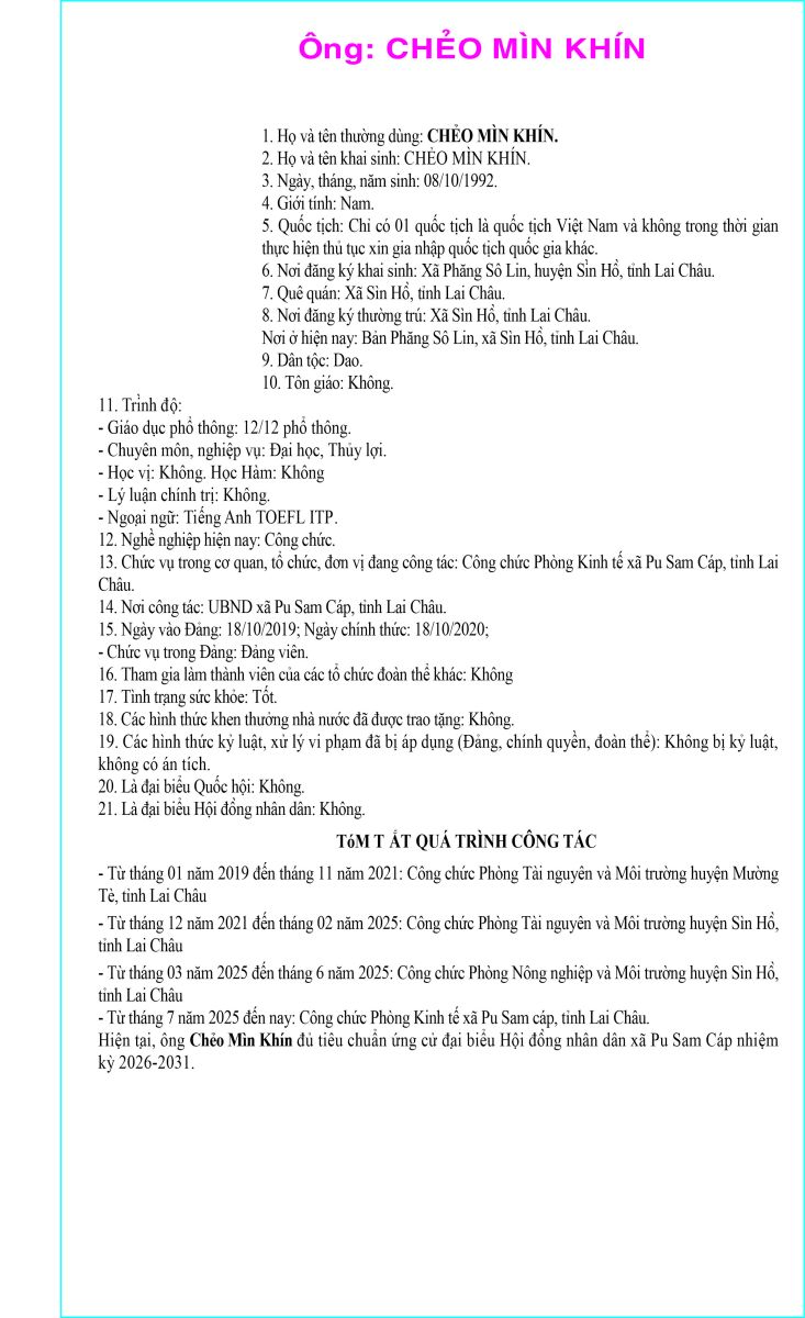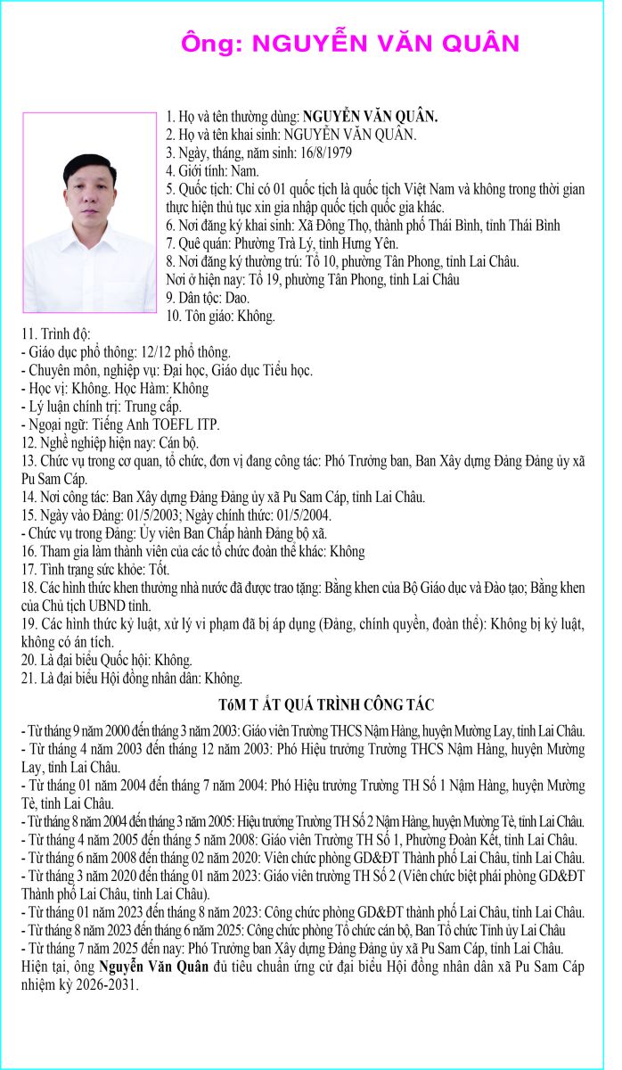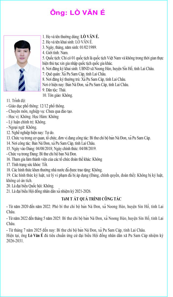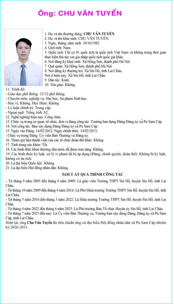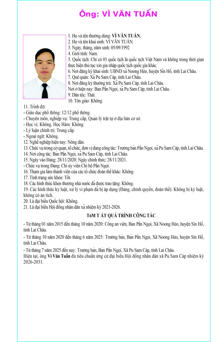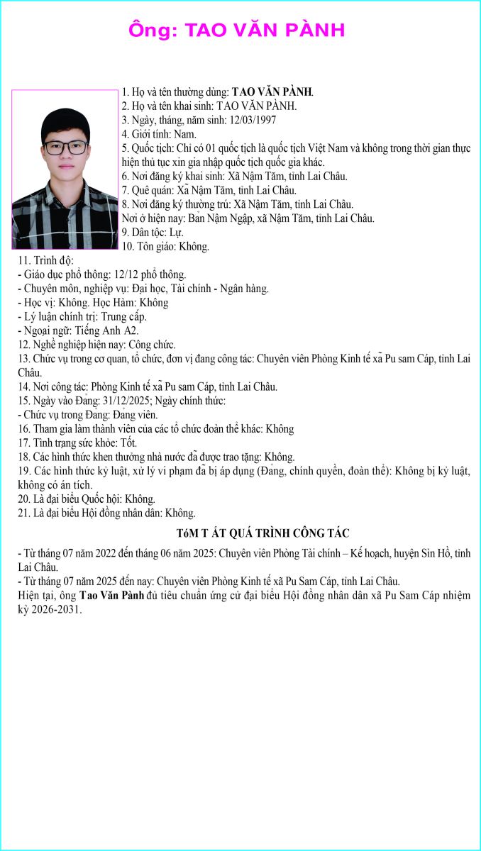 TIỂU SỬ TÓM TẮT NGƯỜI ỨNG CỬ ĐẠI BIỂU HỘI ĐỒNG NHÂN DÂN XÃ PU SAM CÁP NHIỆM KỲ 2026 - 2031 TẠI ĐƠN VỊ BẦU CỬ SỐ 4