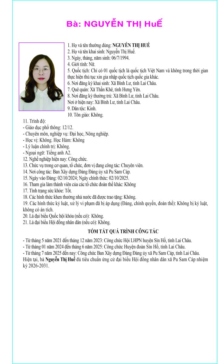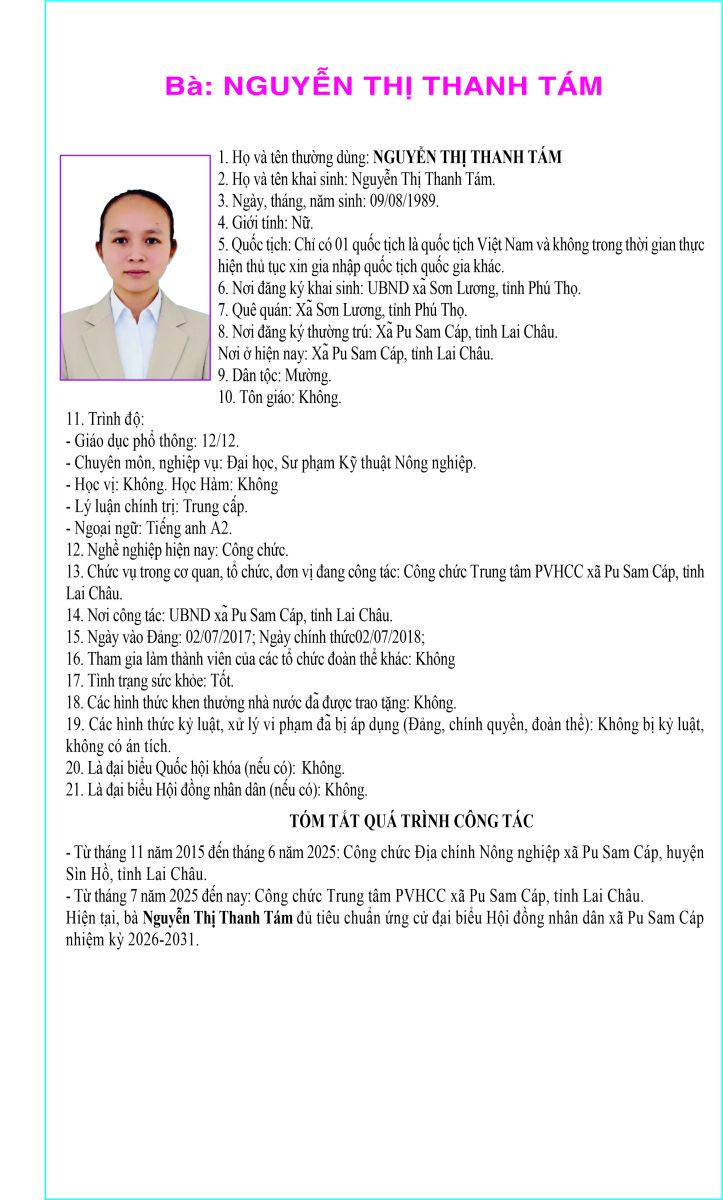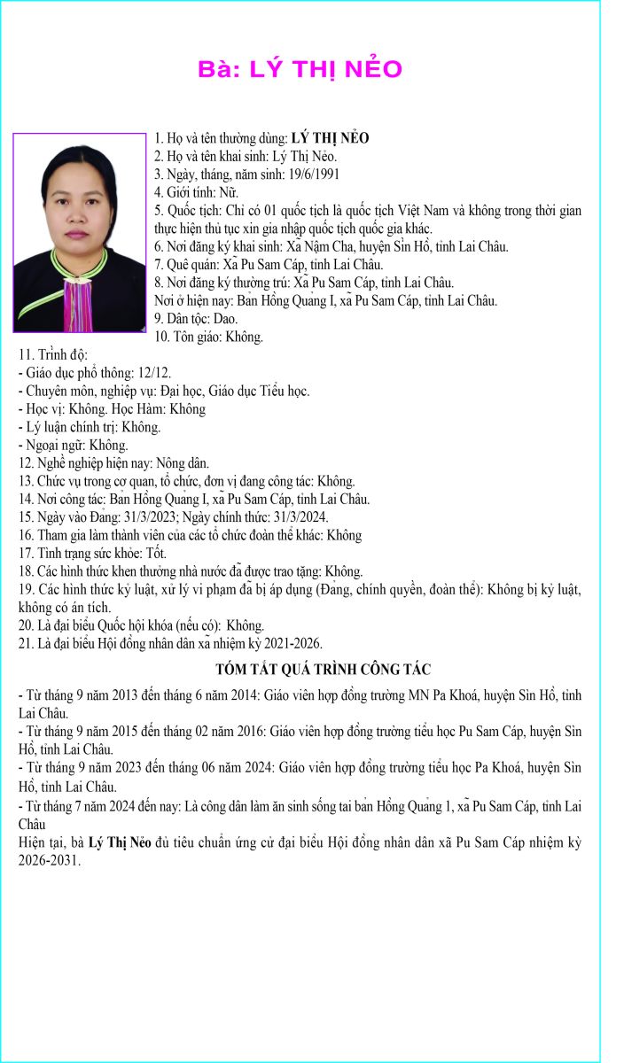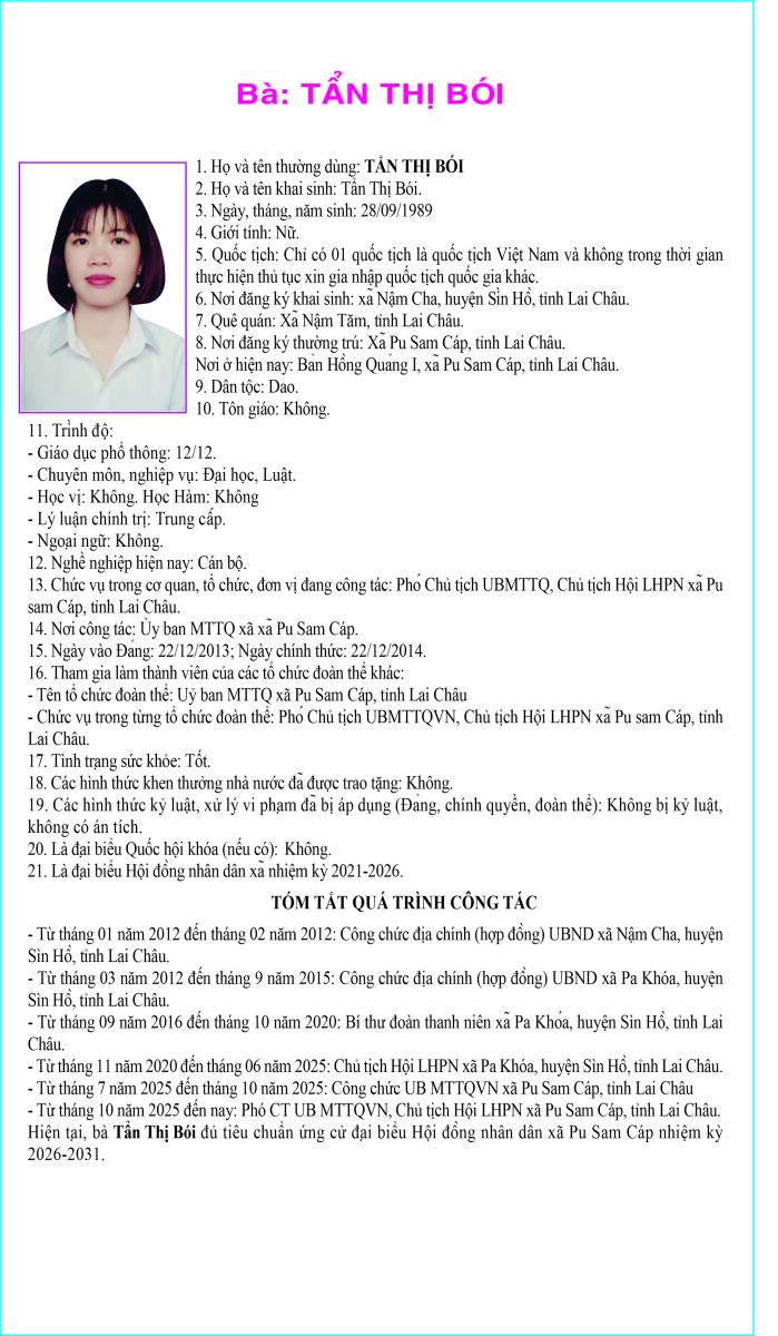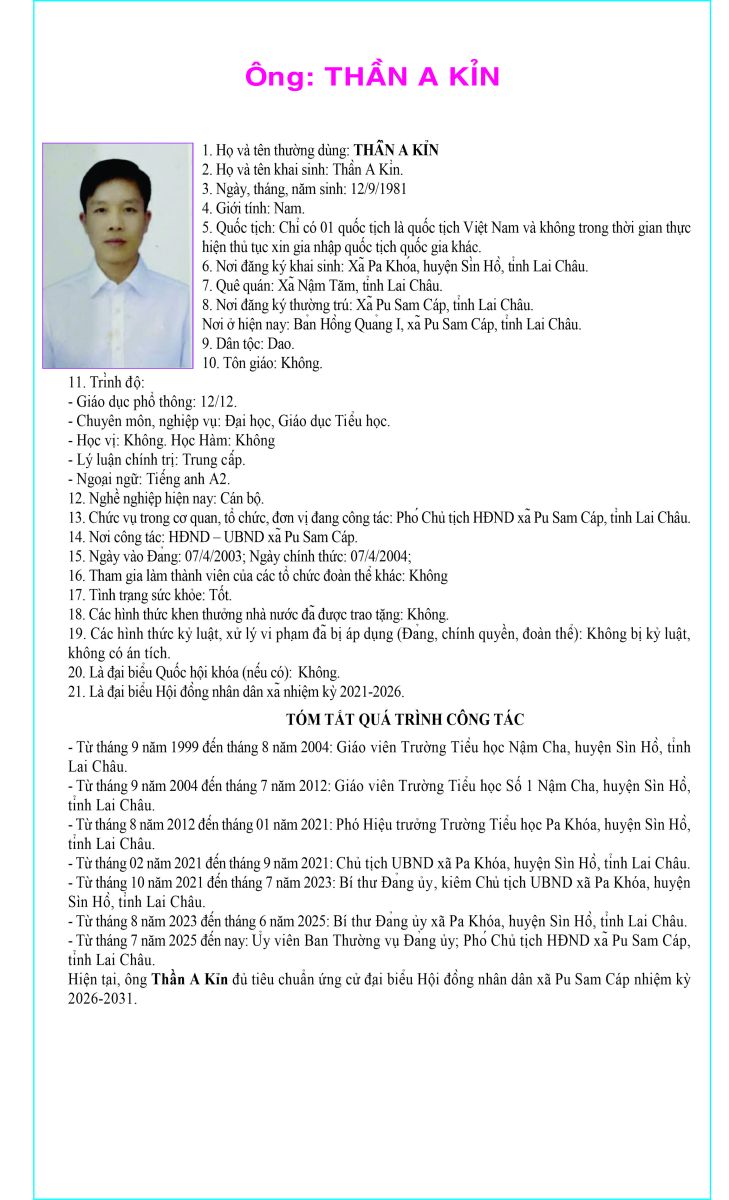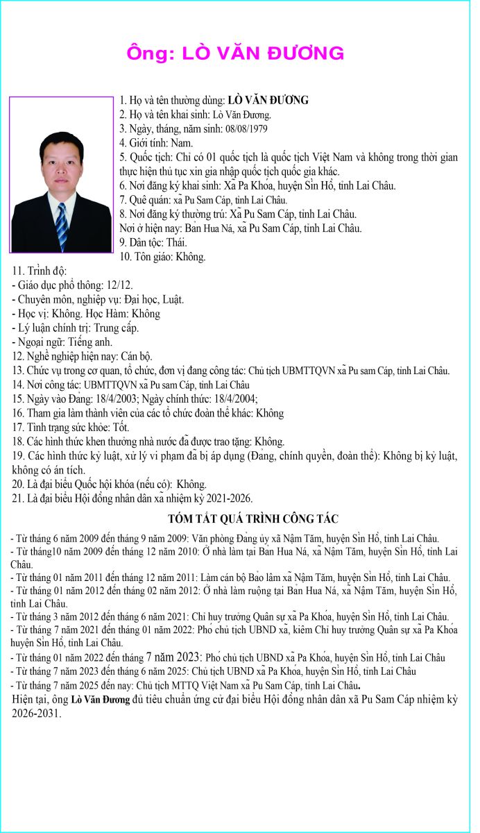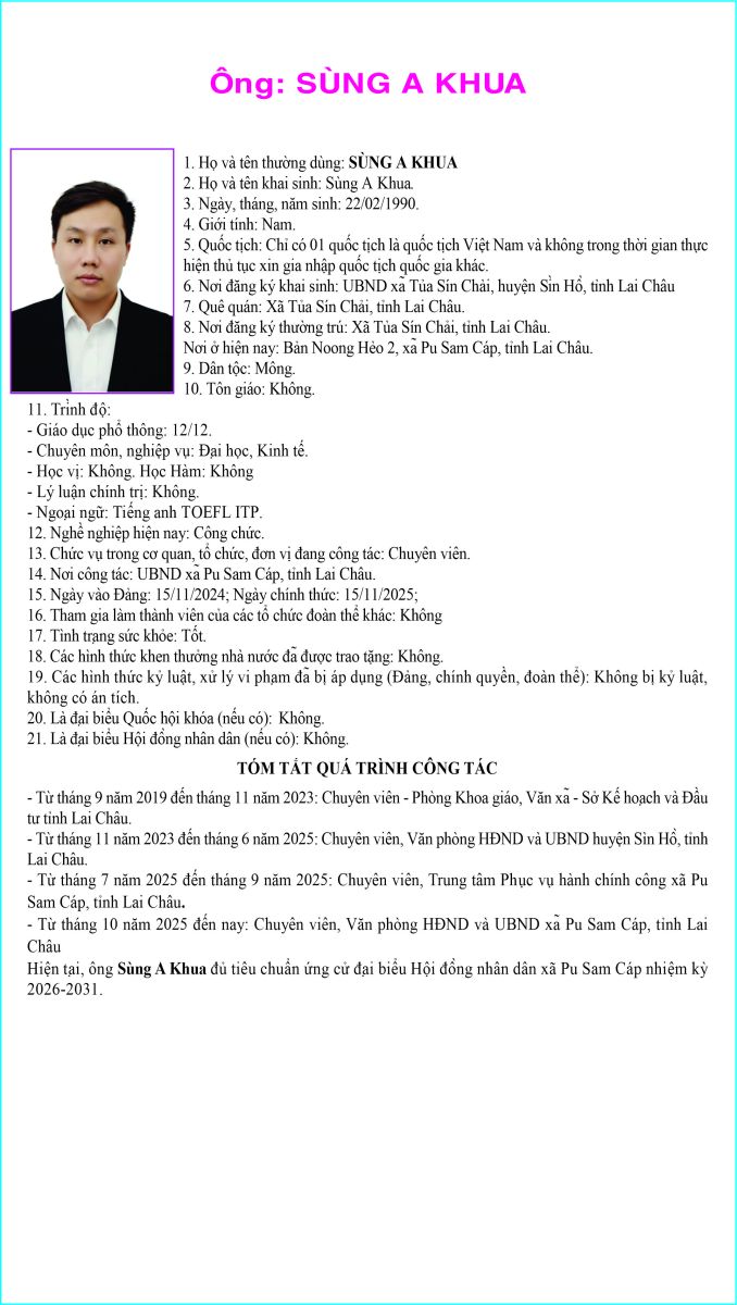 TIỂU SỬ TÓM TẮT NHỮNG NGƯỜI ỨNG CỬ ĐẠI BIỂU HỘI ĐỒNG NHÂN DÂN XÃ PU SAM CÁP NHIỆM KỲ 2026 - 2031 TẠI ĐƠN VỊ BẦU CỬ SỐ 1