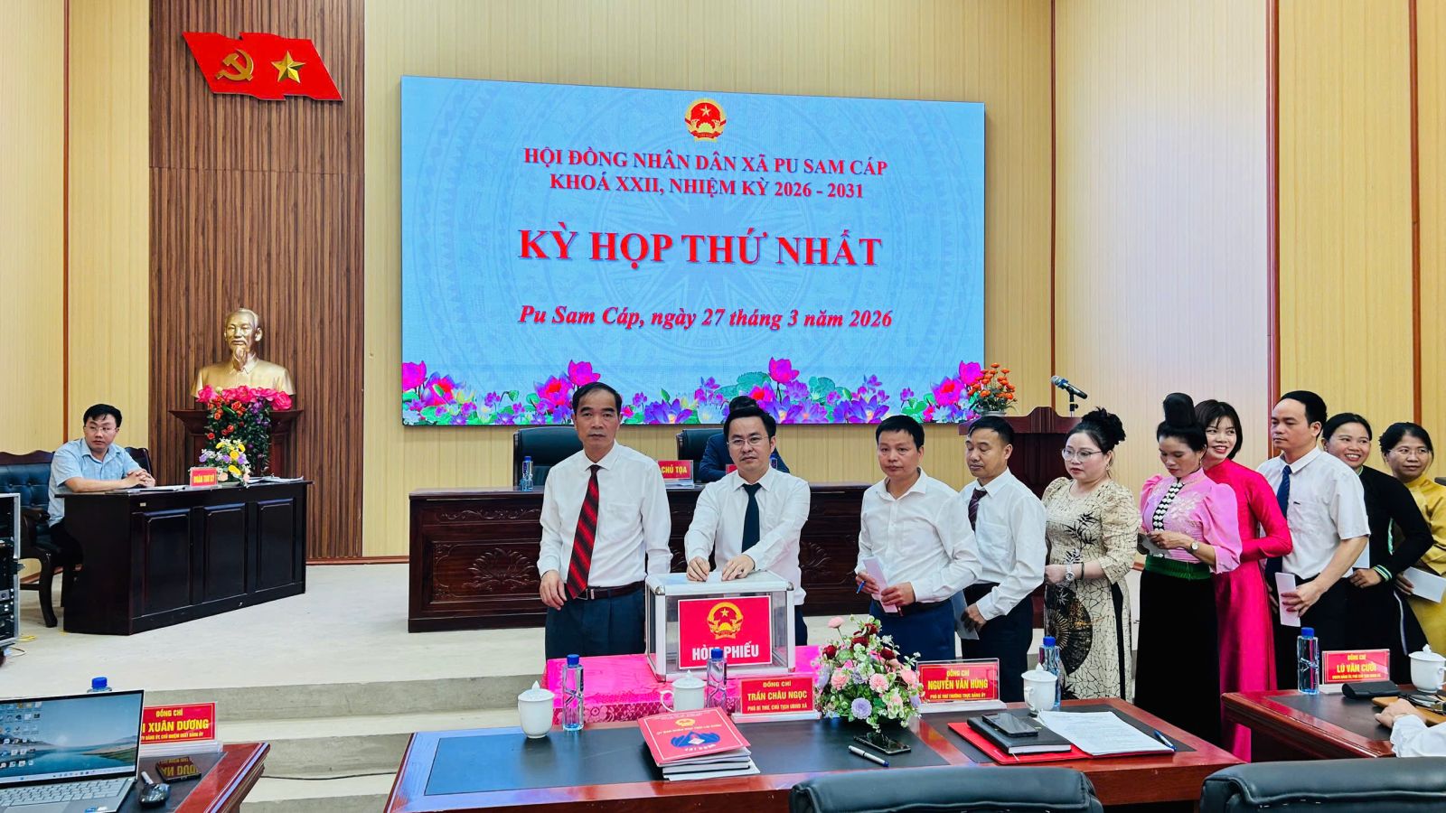 Đặc biệt tại Kỳ họp thứ nhất HĐND xã khoá XXII, nhiệm kỳ 2026 - 2031, các đại biểu đã phát huy tinh thần dân chủ, trách nhiệm cao để bầu các chức danh Chủ tịch, Phó chủ tịch, Trưởng các ban HĐND xã khoá XXII, nhiệm kỳ 2026 - 2031. Đồng thời cũng đã bầu Chủ tịch, Phó chủ tịch và các Uỷ viên UBND xã nhiệm kỳ 2026 - 2031. Trong đó đồng chí Nguyễn Văn Hùng – Phó bí thư Thường trực Đảng ủy xã trúng cử chức danh Chủ tịch HĐND xã khoá XXII, nhiệm kỳ 2026 - 2031; đồng chí Trần Châu Ngọc được bầu giữ chức Chủ tịch UBND xã Pu Sam Cáp nhiệm kỳ 2026 - 2031.