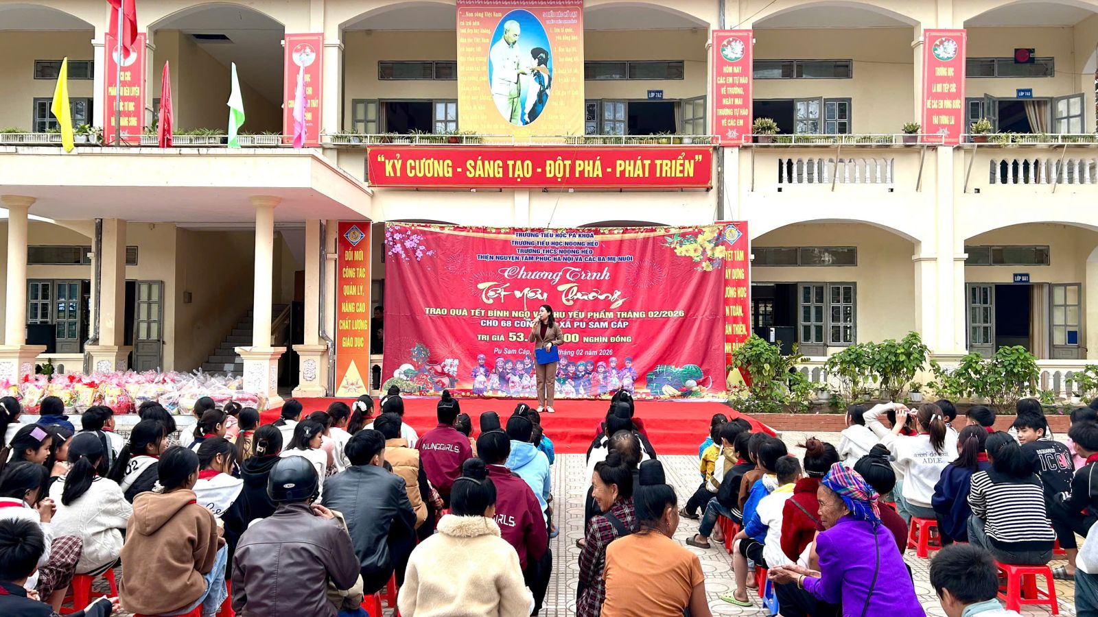 Trong không khí ấm áp của những ngày giáp Tết Nguyên đán Bính Ngọ 2026, sáng ngày 10/2/2026, tại sân Trường THCS Noong Hẻo, xã Pu Sam Cáp đã diễn ra chương trình “Tết yêu thương – Trao quà Tết Bình Ngọ và nhu yếu phẩm tháng 02/2026” dành cho các em học sinh có hoàn cảnh đặc biệt khó khăn trên địa bàn xã.