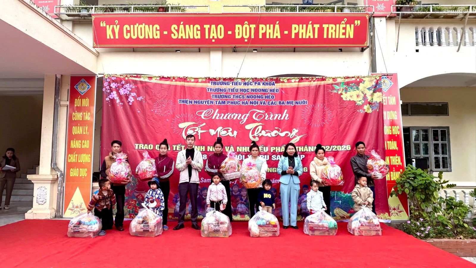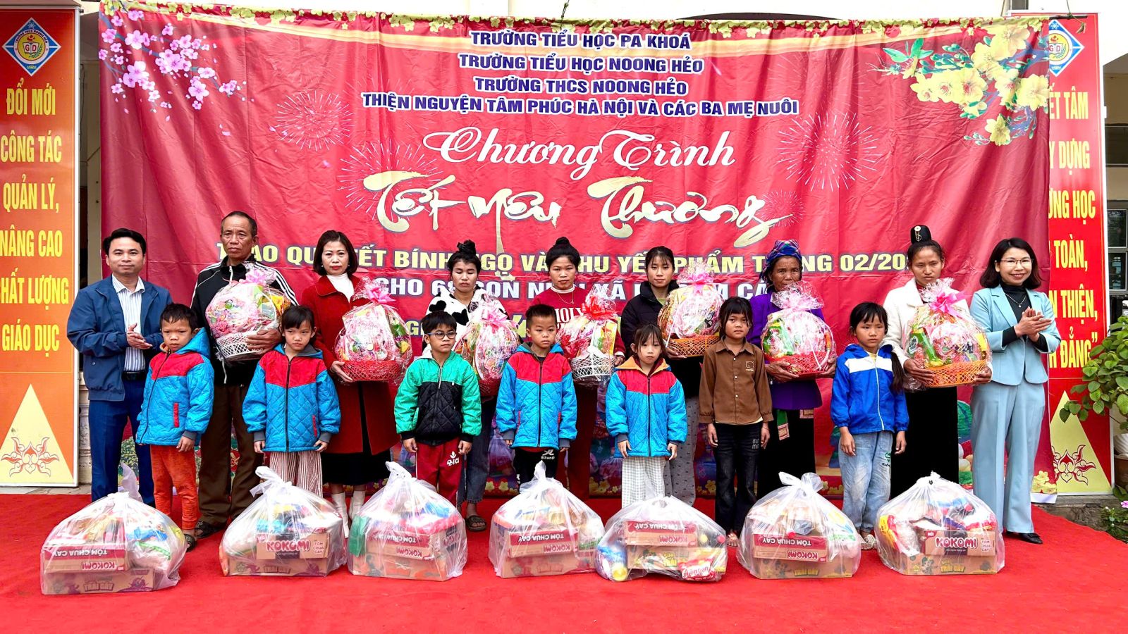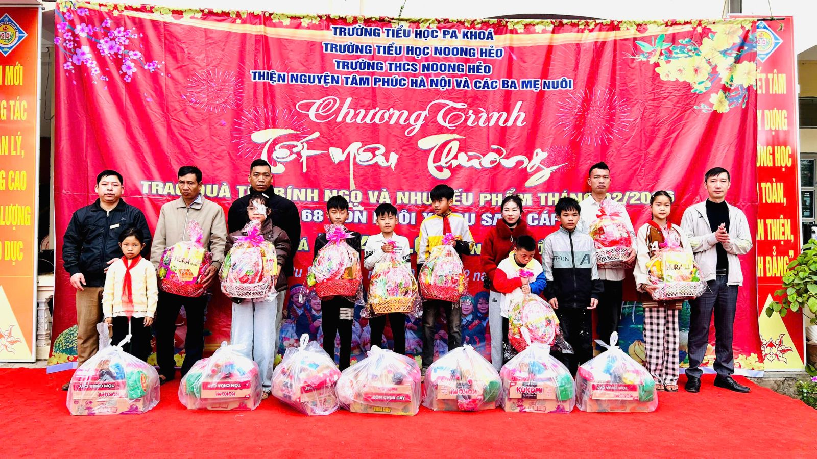 Tại chương trình, Ban Tổ chức đã trao 36 suất quà Tết yêu thương cho học sinh có hoàn cảnh đặc biệt khó khăn thuộc ba cấp học mầm non, tiểu học và THCS Noong Hẻo. Đây là các em học sinh trong tổng số 68 em con nuôi đang được thiện nguyện Tâm Phúc Hà Nội và các ba, mẹ nuôi nhận hỗ trợ, chăm sóc trên địa bàn xã Pu Sam Cáp.