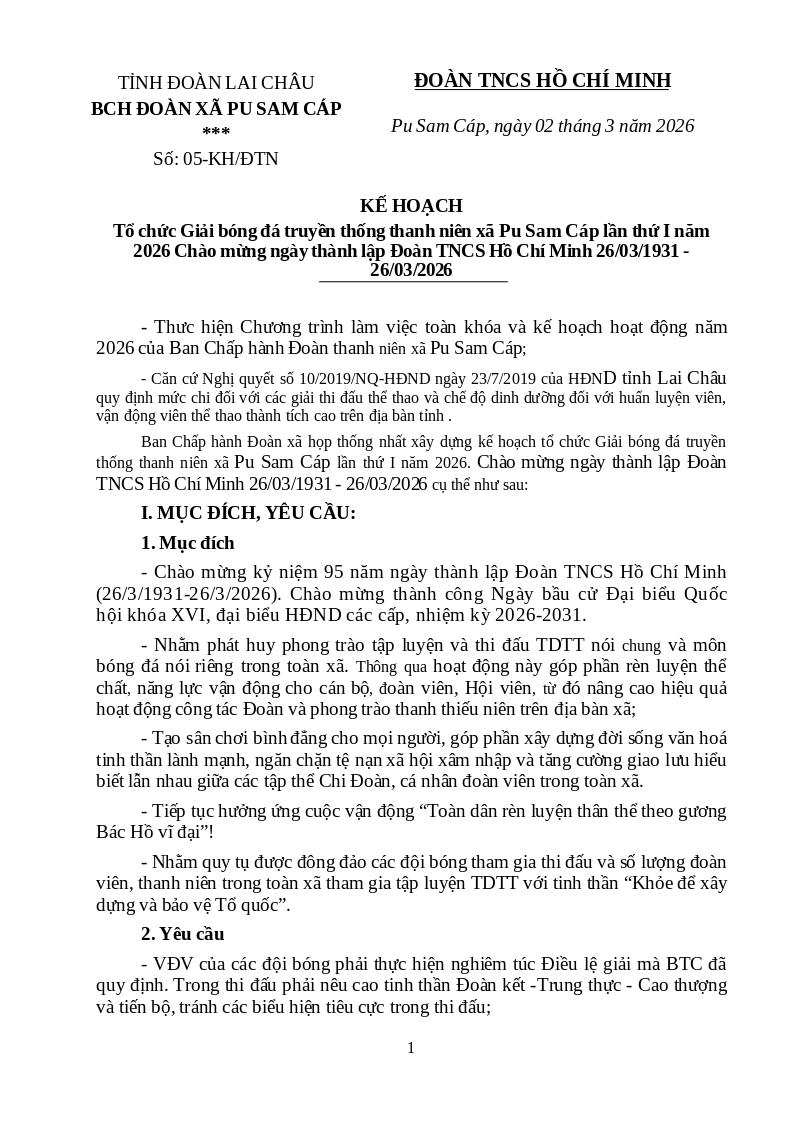 | Tiêu đề văn bản | KẾ HOẠCH TỔ CHỨC GIẢI BÓNG ĐÁ TRUYỀN THỐNG THANH NIÊN XÃ PU SAM CÁP LẦN THỨ 1 NĂM 2026 | ||