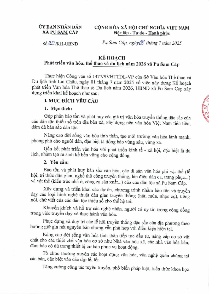 | 3 | 20/KH-UBND | 20 Kế hoạch phát triển văn hóa, thể thao và du lịch năm 2026 | 08/07/2025 | ||||