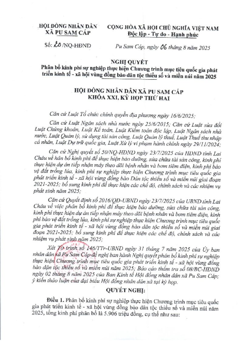 | Tiêu đề văn bản | 20 Nghị quyết phân bổ kinh phí sự nghiệp cho thực hiện chương trình mục tiêu Quốc gia phát triển KTXH vùng đồng bào dân tộc miền núi năm 2025 | ||